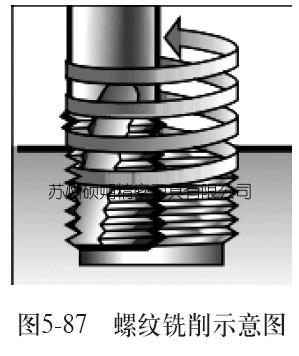 以往比較傳統(tǒng)的螺紋加工方式是采用絲錐攻螺紋孔,這種加工方式效率低,難以保證螺紋加工精度,且絲錐斷裂后極易導(dǎo)致工件報(bào)廢。在現(xiàn)代螺紋加工中,已逐步采用銑削方式替代傳統(tǒng)加工方法。螺紋銑削的優(yōu)點(diǎn)在于加工效率高,通過(guò)刀具選型和調(diào)整加工參數(shù)可對(duì)螺紋加工精度進(jìn)行良好的控制;刀具通用性好,對(duì)于相同螺距、不同直徑的螺紋孔,采用絲錐加工需要多把刀具才能完成,而采用螺紋銑刀加工,則使用一把螺紋銑削刀具即可,與其他螺紋加工相比,螺紋銑刀使用壽命延長(zhǎng)20-40%;加工安全性高,采用螺旋插補(bǔ)銑削方式不用擔(dān)心刀具損壞帶來(lái)的負(fù)面效果,螺紋銑削如圖5-87所示。