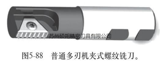 1.普通機(jī)夾式螺紋銑刀 機(jī)夾式螺紋銑刀主要用于銑削較大直徑的內(nèi)螺紋,也可銑削外螺紋。由于該刀片易于制造,價(jià)格較低,但抗沖擊性能較整體螺紋銑刀稍差。因此,該刀具常推薦用于加工鋁合金材料,其結(jié)構(gòu)與普通機(jī)夾式銑刀類似,由可重復(fù)使用刀桿和可方便更換的刀片組成。在選擇機(jī)夾式螺紋銑刀時(shí),應(yīng)根據(jù)被加工螺紋的直徑、深度和工件材料等因素,盡量選用直徑較大的刀桿和適當(dāng)?shù)镀牟馁|(zhì)。如圖5-88所示為普通多刃機(jī)夾式螺紋銑刀。