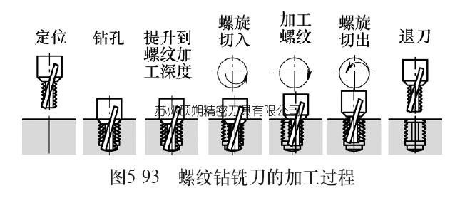 鉆削部分直徑就是刀具所能加工螺紋的底徑。螺紋鉆銑刀是將鉆孔與攻絲結(jié)合的工藝(以相反的順序完成)。切削刃尖端的形狀類似于鉆頭,而主體具有螺紋形狀,在柄部附近具有埋頭孔。切削刃首先插入鉆孔,然后進(jìn)行螺紋插補(bǔ)同時(shí)形成倒棱。這個(gè)工藝的優(yōu)點(diǎn)是減少了刀具,刀架,無(wú)需換刀;螺紋加工過(guò)程見(jiàn)圖5-93。