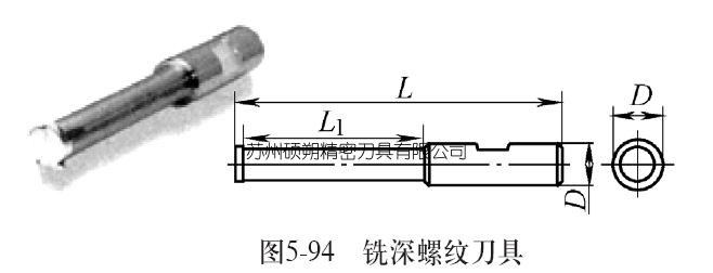 6. 銑深螺紋刀具 銑深螺紋刀具(見(jiàn)圖5-94)是一種單齒螺紋銑刀。一般的螺紋銑刀刀刃上有多個(gè)螺紋加工齒,刀具與工件接觸面積大,切削力也大,且加工內(nèi)螺紋時(shí)刀具直徑必須小于螺紋孔徑。由于刀體直徑受到限制,影響刀具剛性,且銑螺紋時(shí)刀具為單側(cè)受力,銑削較深螺紋時(shí)易出現(xiàn)讓刀現(xiàn)象,影響螺紋加工精度,因此一般的螺紋銑刀有效切削深度約為其刀體直徑的2倍,而使用單齒的銑深螺紋刀具可以較好克服上述缺點(diǎn)。由于減小了切削力,可大幅提高螺紋加工深度(見(jiàn)圖5-94中L1)。