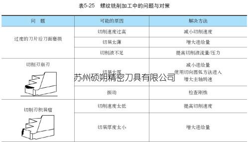 螺紋銑刀和其他銑刀一樣,在銑削加工過(guò)程中會(huì)遇到刀片磨損、崩刃、積屑瘤等現(xiàn)象,表5-25為螺紋銑削加工中常見(jiàn)的幾個(gè)問(wèn)題及相應(yīng)的解決方案。