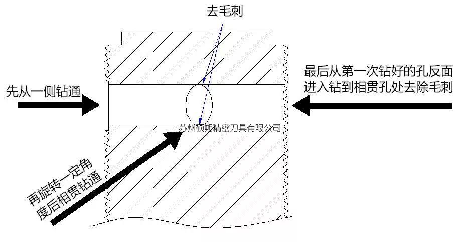 加工難點(diǎn)一:被加工孔的孔底出口表面是外螺紋表面,刀具鉆通出孔底時,外螺紋表面對刀具的損傷較大,刀具切削刃口容易崩缺。 加工難點(diǎn)二:被加工孔是個貫穿孔,在第一次鉆完孔后,需要再進(jìn)行一次相貫的鉆削加工,刀具在第二次加工貫穿第一次已加工孔時,切削刃口容易崩缺。 加工難點(diǎn)三:為了去除相貫孔處的毛刺,需要此款刀具再從第一次已經(jīng)鉆好的孔反面進(jìn)入,鉆入到相貫孔處去除毛刺。刀具在鉆入已經(jīng)加工好的孔時,刀具的兩側(cè)刀尖容易崩缺。 目前客戶使用某品牌刀具,在加工到80-120件時,兩側(cè)的刀尖以及切削刃口崩缺嚴(yán)重,導(dǎo)致纏屑,嚴(yán)重的還會斷刀。 |